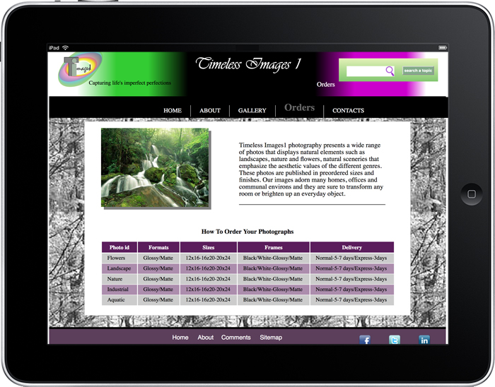 Timeless Images is a start up photography studio featuring a range of unique photographic products and services with a concentration on the unprepared and imperfect perfection of nature and natural beauty that makes the environments a revolving stage of beautiful displays. Prints of the vast collections of expertly captured images are all limited editions.